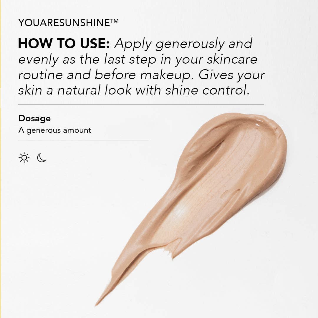 Protecting, Soothing, Pore-Perfecting YOUARESUNSHINE is a High-Defense Mineral & Physical Tinted Sunscreen that Doubles as a Soothing Primer. It is Designed to Blur Imperfections, Calm Irritation & Support an Outdoor Lifestyle. Active Ingredient: 21% Zinc Oxide (non-nano) Benefits: This multitasking tinted sunscreen is designed to protect all skin types (including sensitive skin) that are prone to scar damage, acne, rosacea, dryness, and discoloration. Formulated with green tea, gotu kola, and horse chestnut to calm the skin, stimulate collagen and reduce the look of scars and dark spots. Wear on its own, or layer under makeup as a daily primer to give skin a naturally, even texture and skin tone.