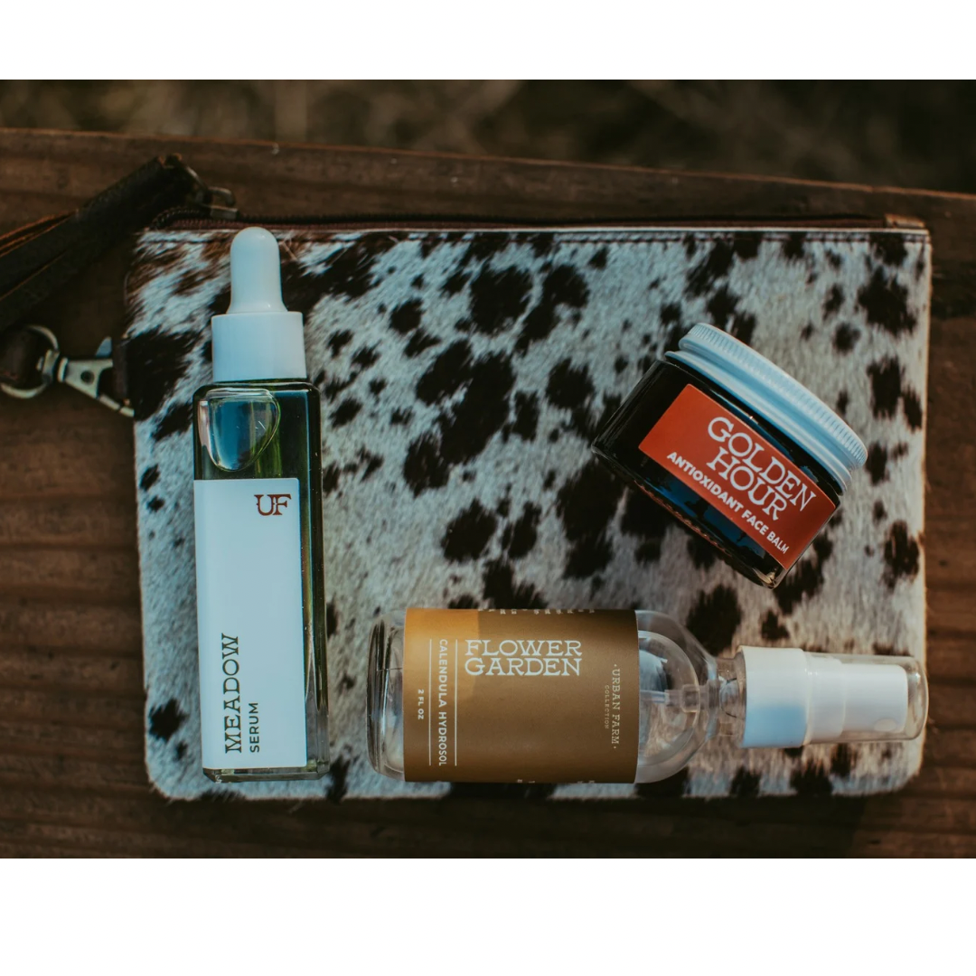 Introducing the perfect gift for lovers of cowhide + natural skincare! Each bundle includes one unique cowhide clutch, one Golden Hour Antioxidant Balm, one Calendula Hydrosol, and one Meadow serum. (Clutch Approx. Dimensions: 7.25" x 5.5")