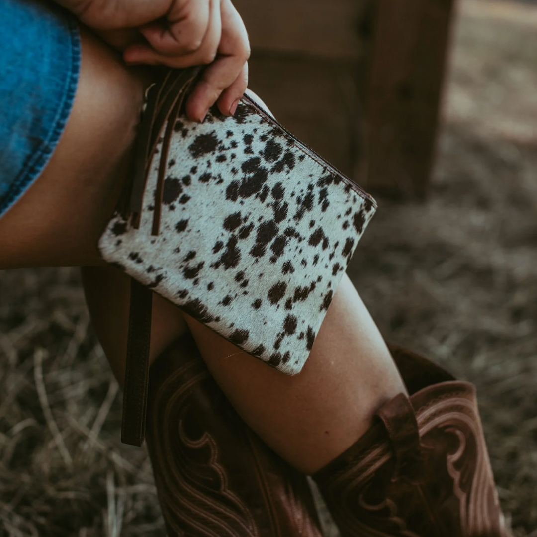Keep your essentials organized with one zipper pocket and a built-in credit card holder with 3 slots. The luxurious leather back adds a touch of sophistication, while the detachable wristlet offers endless possibilities. Each wristlet is crafted from unique cowhide for a one-of-a-kind look. Note: the bag pictured is only an example—expect unique variations, spotting, and coloring!