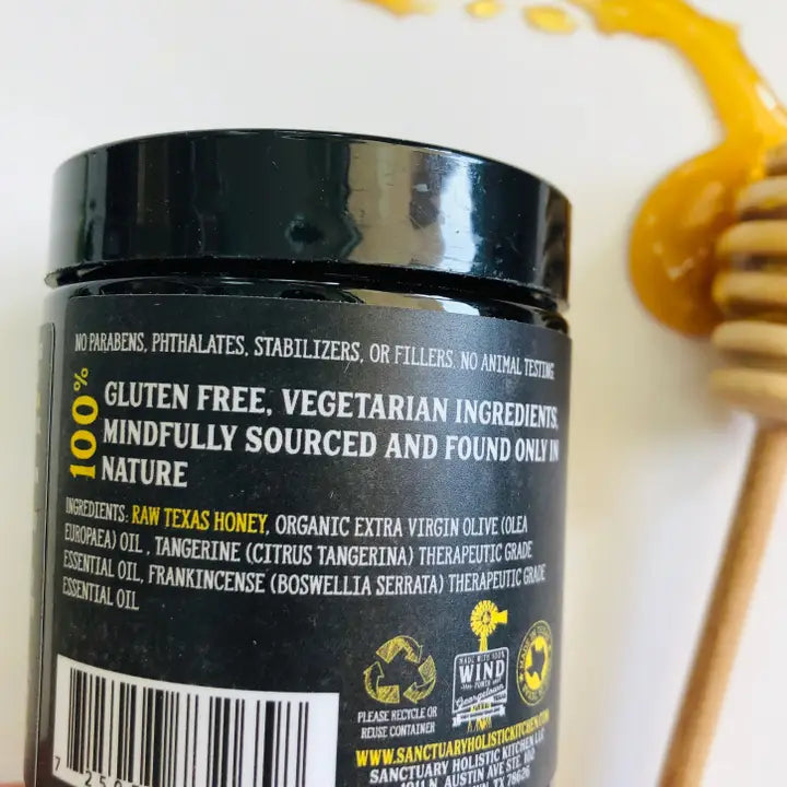 Ingredients: raw Texas honey, olive oil, therapeutic grade essential oils of tangerine
