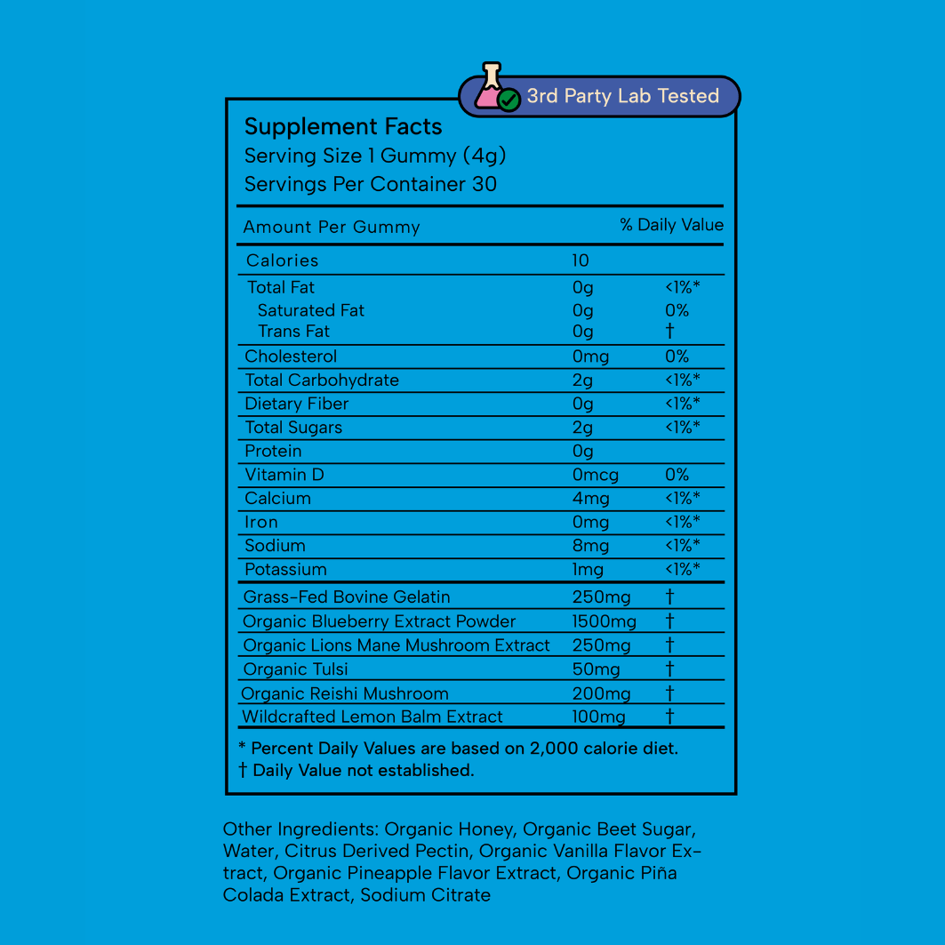 Pina Colada: Active Ingredients (Organic or Wildcrafted): Reishi Mushroom Extract 200mg, Lion's Mane Mushroom Extract 200mg, Lemon Balm Extract 100mg, Tulsi Powder 50mg, Blueberry Extract Powder 1500mg, Grass Fed Bovine Gelatin 250mg