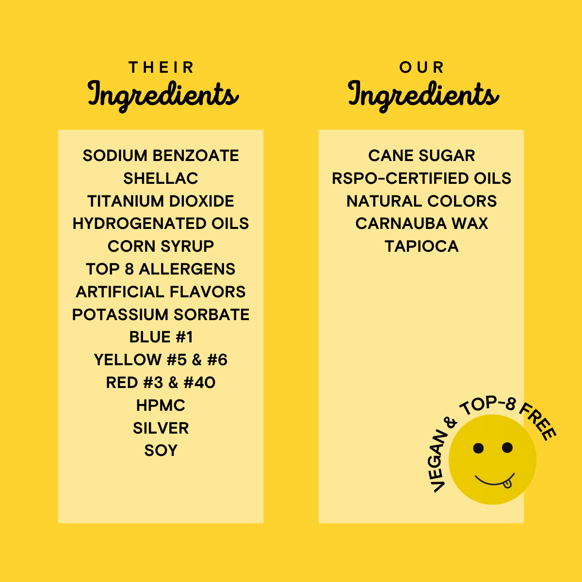 Ingredients: Cane Sugar, Corn Starch, Tapioca Starch, Palm Oil*, Palm Kernel Oil*, Tapioca Maltodextrin, Rice Flour, Sunflower Lecithin, Xanthan Gum, Gum Arabic, Spirulina for Color, Carnauba Wax. (*RSPO Certified)