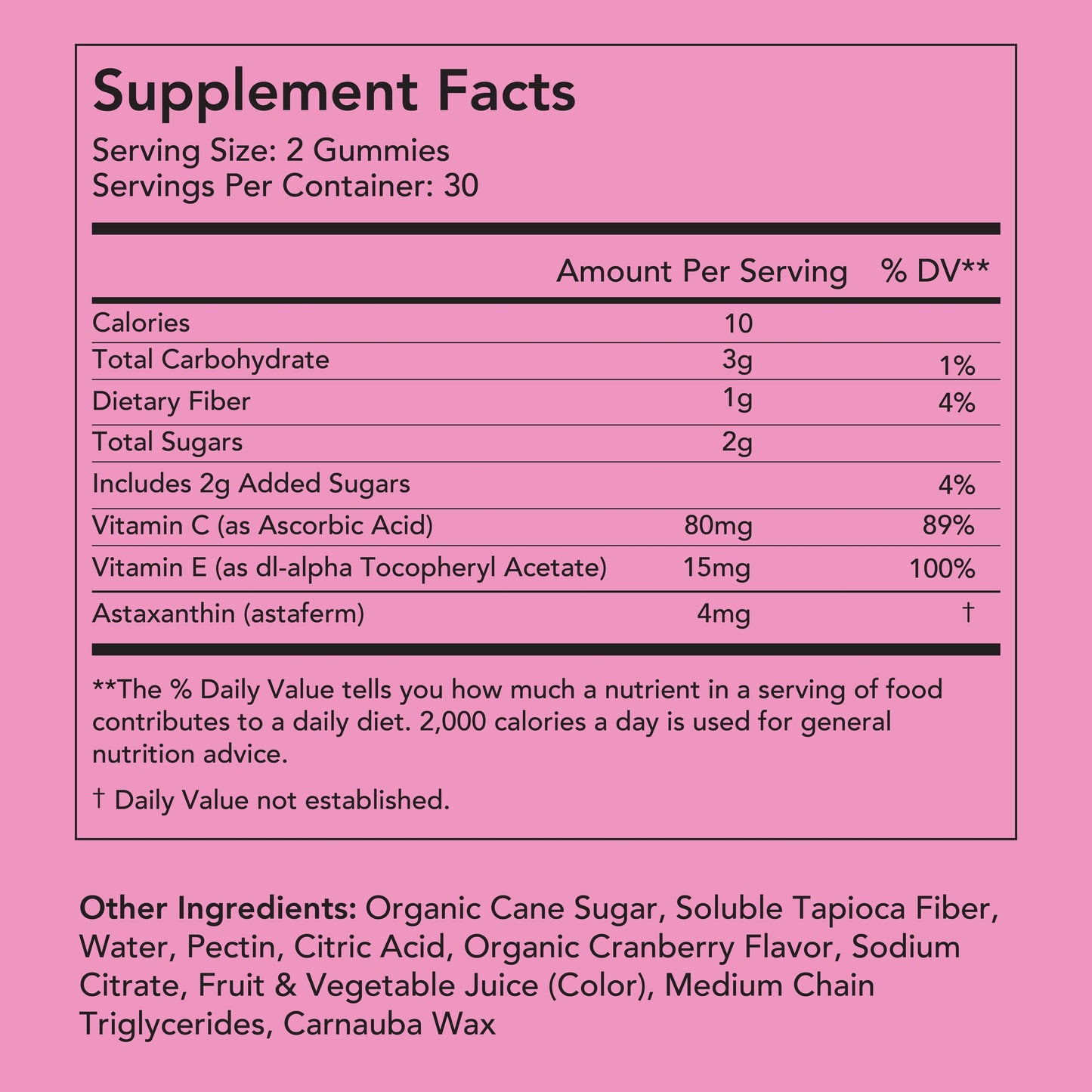 Ingredients: Organic Cane Sugar, Soluble Tapioca Fiber, Water, Pectin, Citric Acid, Organic Cranberry Flavor, Sodium Citrate, Vitamin C, Vitamin E, Astaxanthin, Fruit & Vegetable Juice (Color), Medium Chain Triglycerides, Carnauba Wax