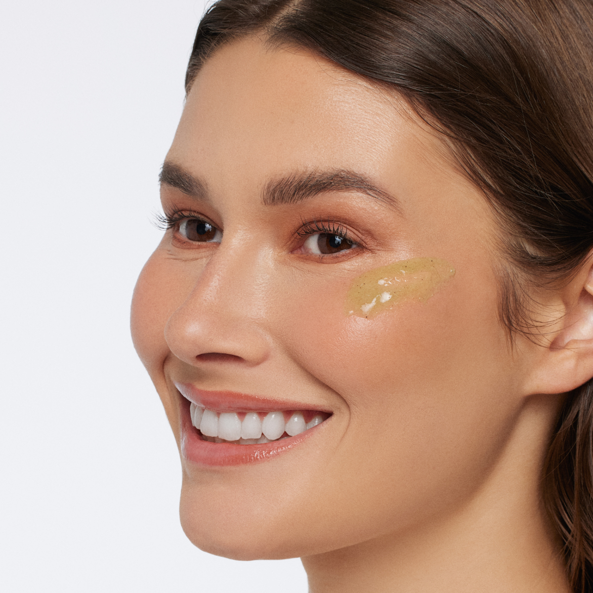 3. Bring hands to face. Begin to gently massage scrub into skin using circular motions (pressure should be LIGHT). Massage into skin for around 20-45 seconds, focusing more on any areas of breakouts. AVOID DIRECT EYE AREA.