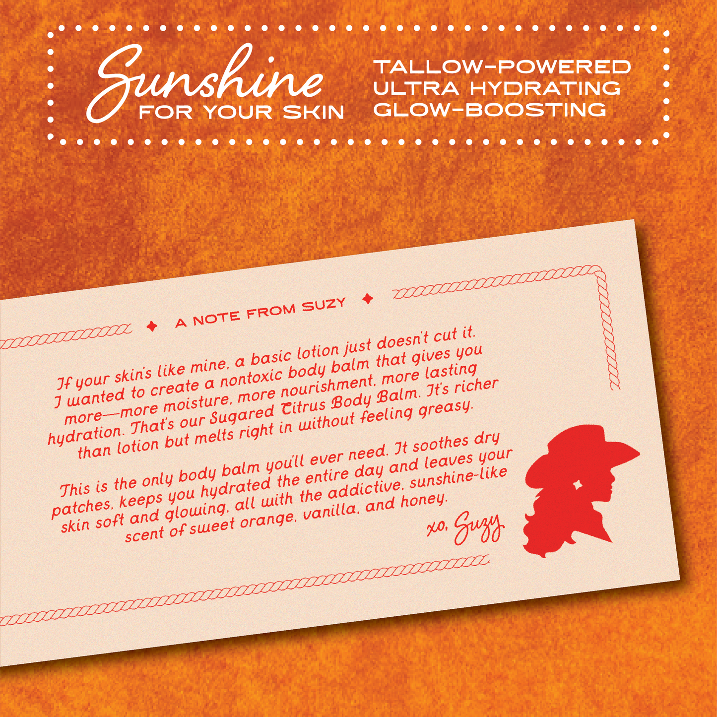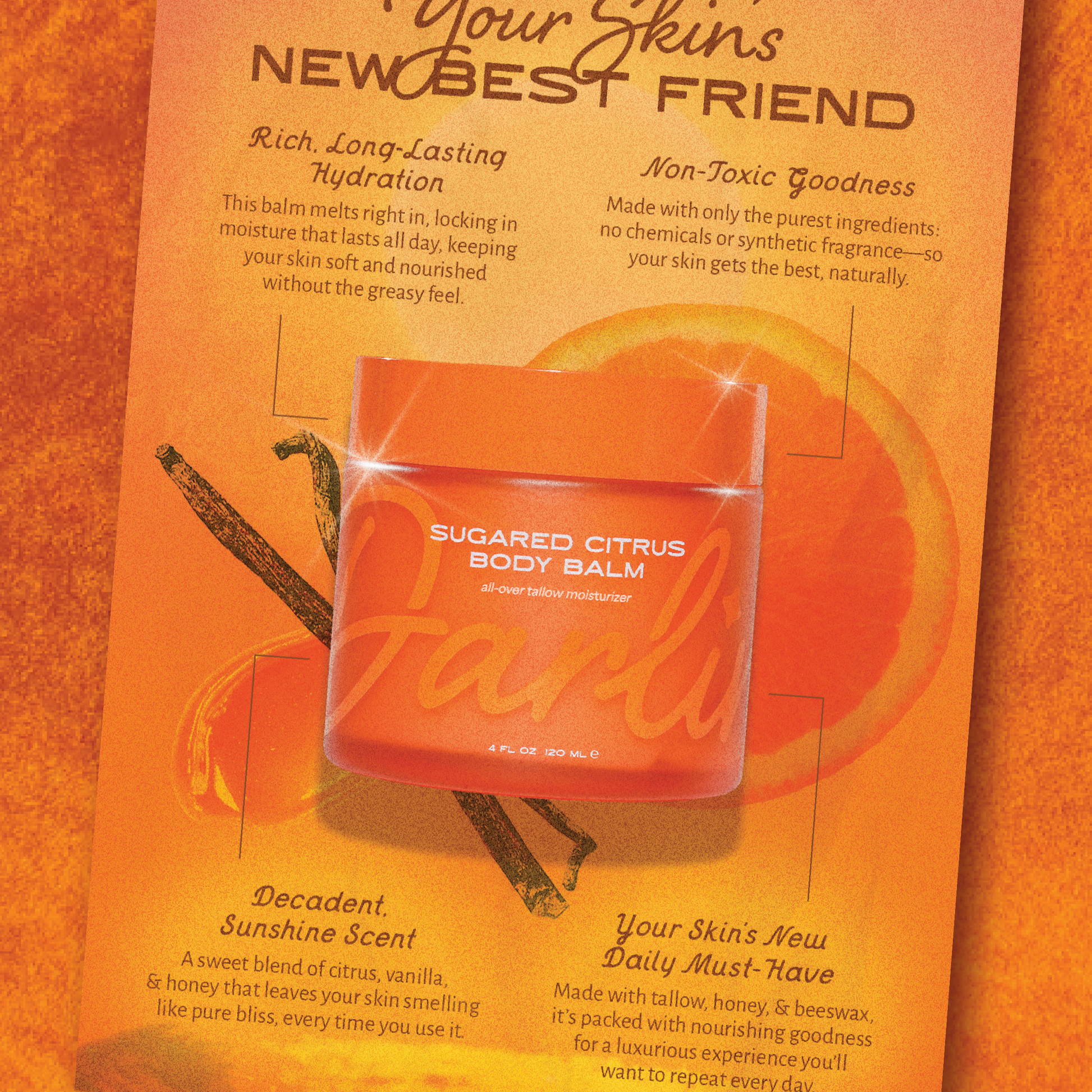Sugared Citrus Body Balm is a sweet, dreamy treat for your skin. Made with tallow, raw honey, vanilla and sweet orange, it melts in to hydrate, soften, and leave you glowing (and smelling so good).