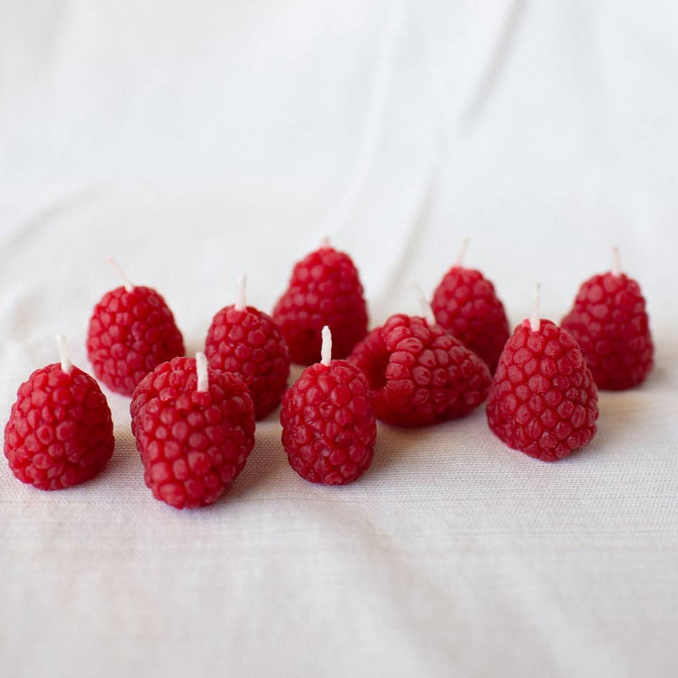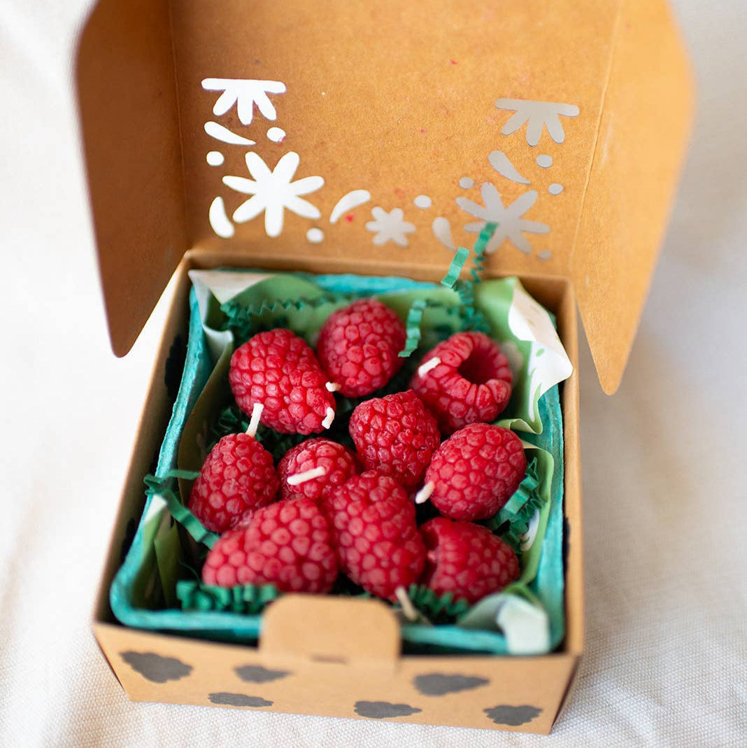 Illuminate your special moments with a touch of warmth, nostalgia, and an irresistible dash of cuteness. 10 beeswax raspberries per box! The packaging includes the adorable berry basket with green crinkle cut inside the brown kraft box.