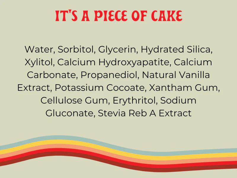 Ingredients: Water, Sorbitol, Glycerin, Hydrated Silica, Xylitol, Calcium Hydroxyapatite, Calcium Carbonate, Propanediol, Natural Vanilla Exract, Potassium Cocoate, Xantham Gum, Cellulose Gum, Erythritol, Sodium Gluconate, Stevia Reb A Extract
