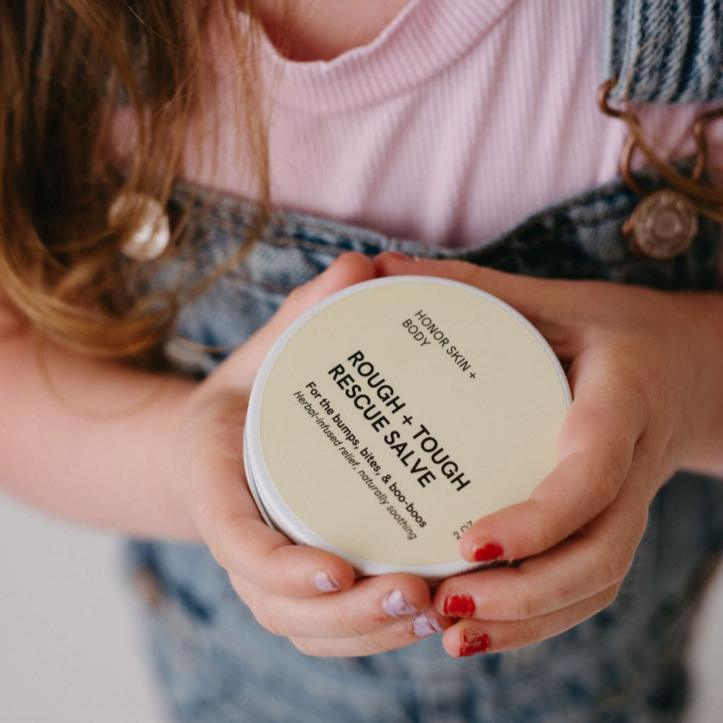 Rough & Tough Rescue Salve is a must-have for active, outdoorsy families who live life hands-on. This rich, skin-loving blend of tallow, beeswax, and jojoba oil is infused with time-tested herbs: calendula to calm inflammation and support skin repair, plantain to soothe irritation and reduce redness, and comfrey, long known as “knitbone,” for its allantoin content that helps support skin regeneration. Whether it’s a scraped knee, a bump from the trail, or skin that's had a rough day, this salve is here to comfort and restore—naturally.