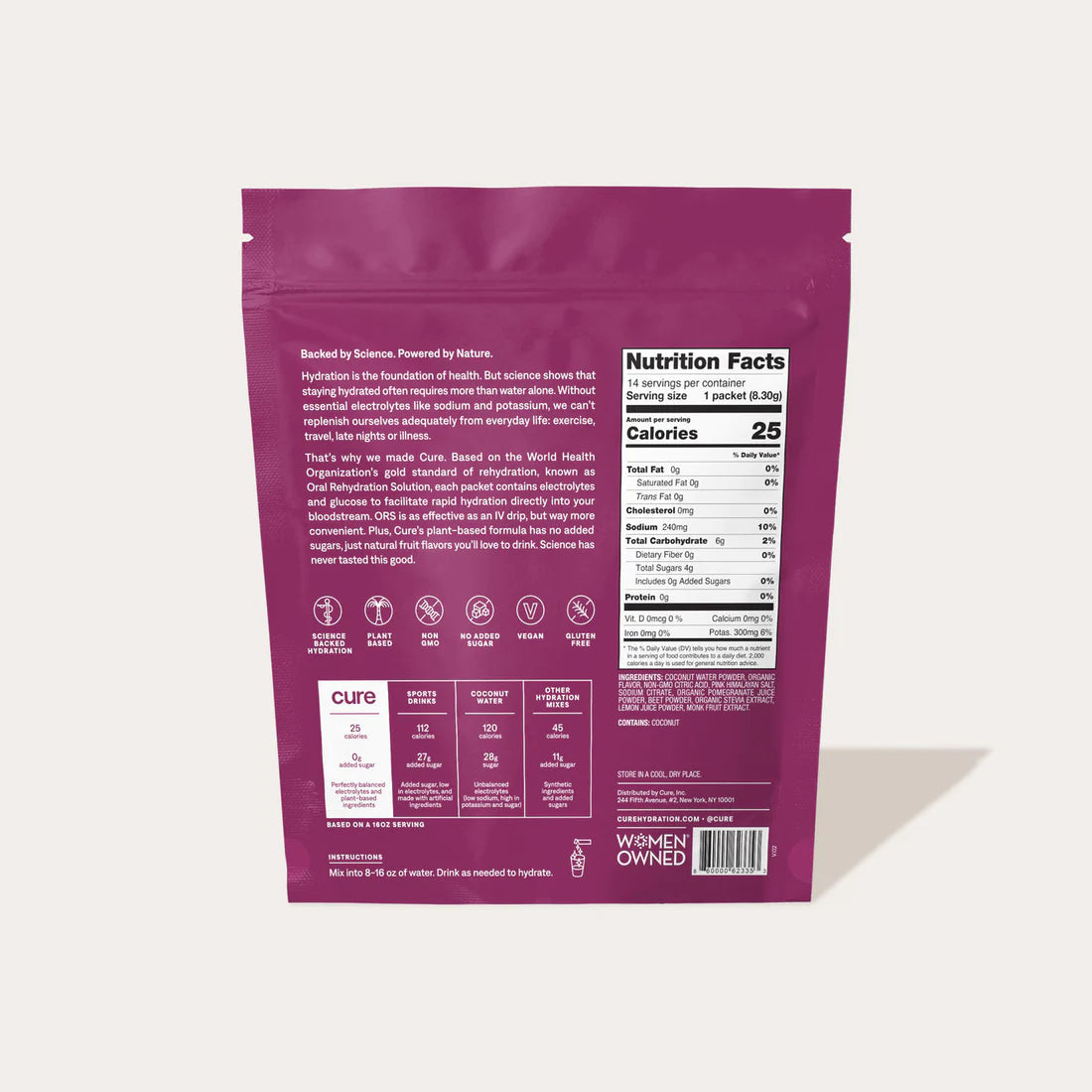 Ingredients: Coconut Water Powder, Non-GMO Citric Acid, Pink Himalayan Salt, Organic Flavor, Sodium Citrate, Organic Stevia Extract, Lemon Juice Powder, Beet Powder (for color), Monk Fruit Extract.
