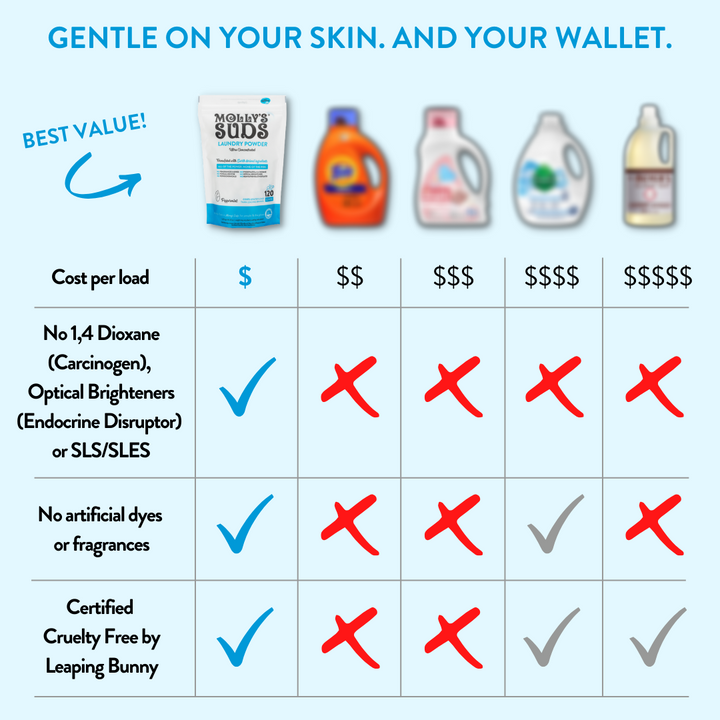 Molly’s Suds Original Laundry Powder does not contain: Harmful Fragrances, Dyes, Cancer-Causing Contaminants like Formaldehyde & 1,4-Dioxane, Volatile Organic Compounds (VOCs), Optical Brighteners, Synthetic Nonylphenol Ethoxylates, Petrochemicals, Phosphates, Chlorine, Sodium Laureth Sulfate (SLES), Phthalates, Parabens, Methylisothiazolinone, Cocamide DEA