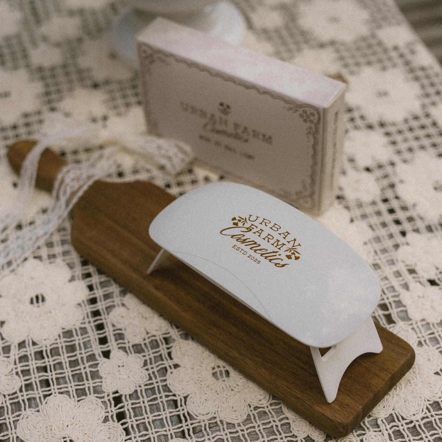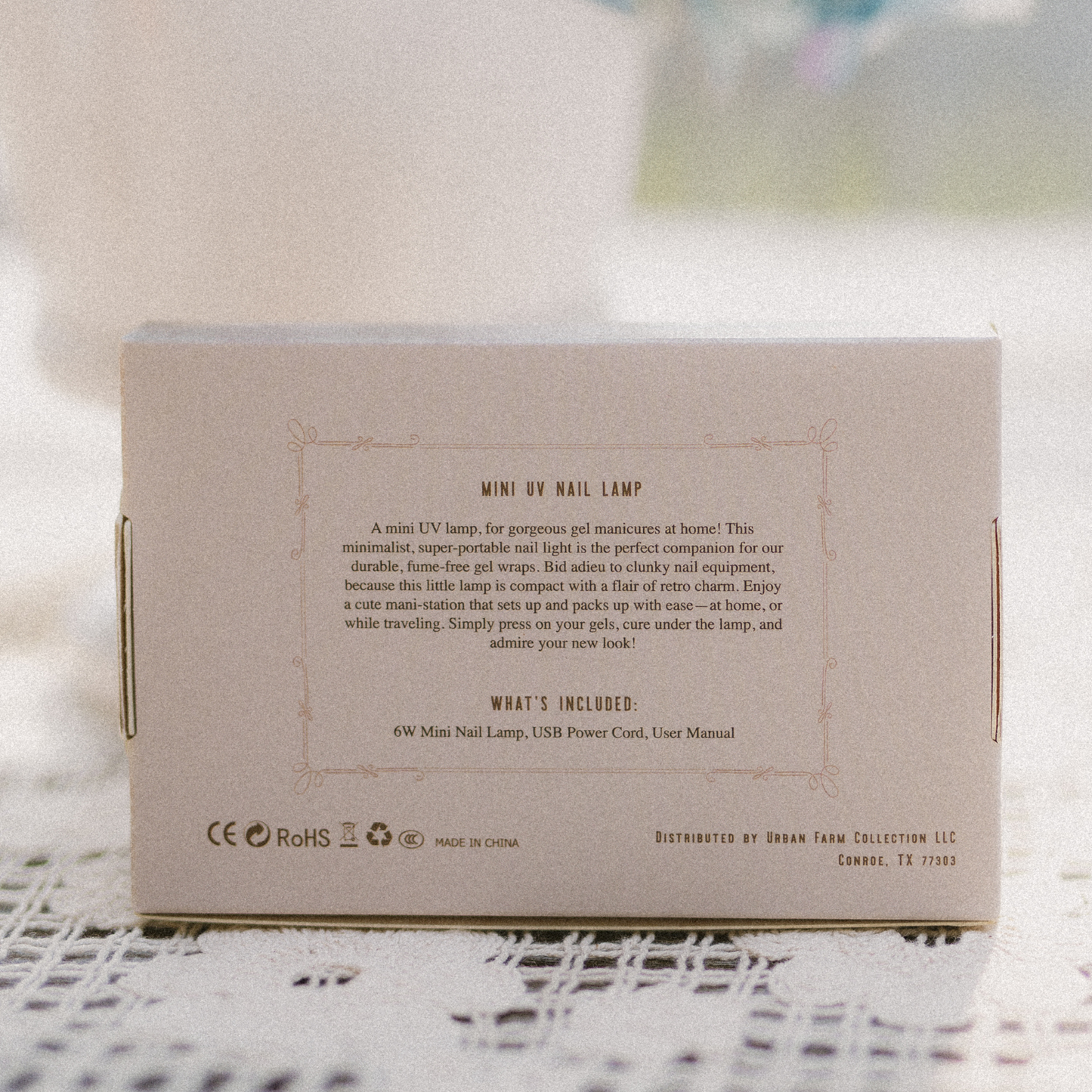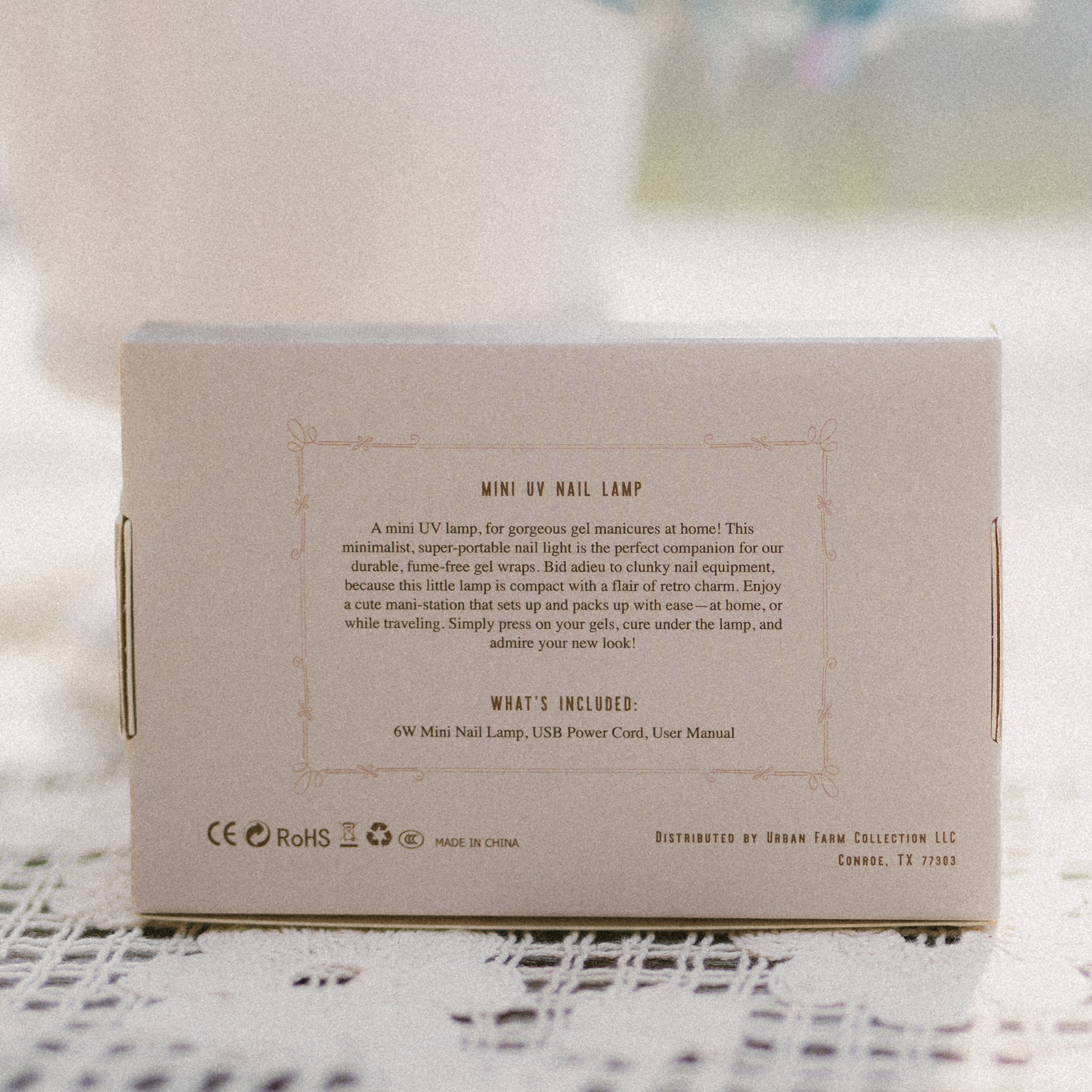 A mini UV lamp, for gorgeous gel manicures at home! This minimalist, super-portable nail light is the perfect companion for our durable, fume-free gel wraps. Bid adieu to clunky nail equipment, because this little lamp is compact with a flair of retro charm. Enjoy a cute mani-station that sets up and packs up with ease—at home, or while traveling. Simply press on your gels, cure under the lamp, and admire your new look!
