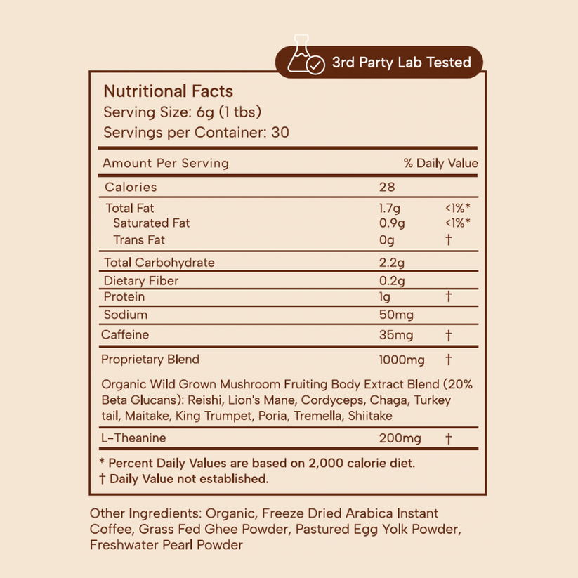 Certified Organic Instant Arabica Coffee, Organic 10-Mushroom Extract Blend (Reishi, Lion’s Mane, Cordyceps, Chaga, Turkey Tail, Maitake, King Trumpet, Poria, Tremella, Shiitake), L-Theanine, Pastured Egg Yolk Powder, Grass-Fed Ghee Powder, Freshwater Pearl Powder